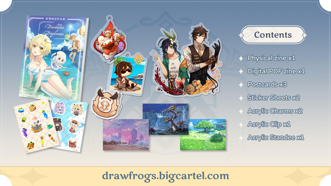 This is an unofficial, for-profit fanbook based on Genshin Impact, organised by Drawfrogs, a group of artists.